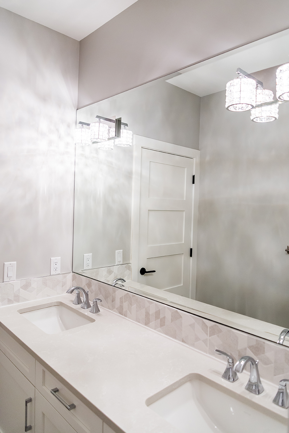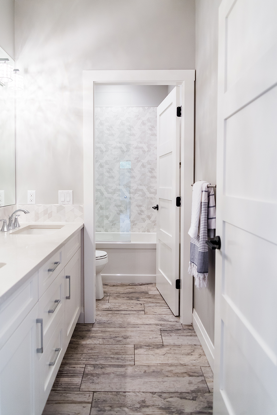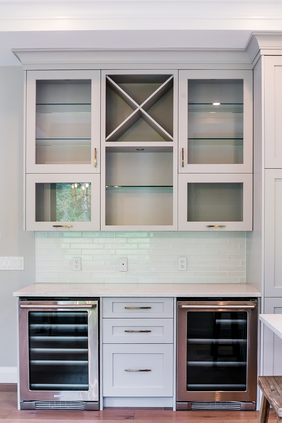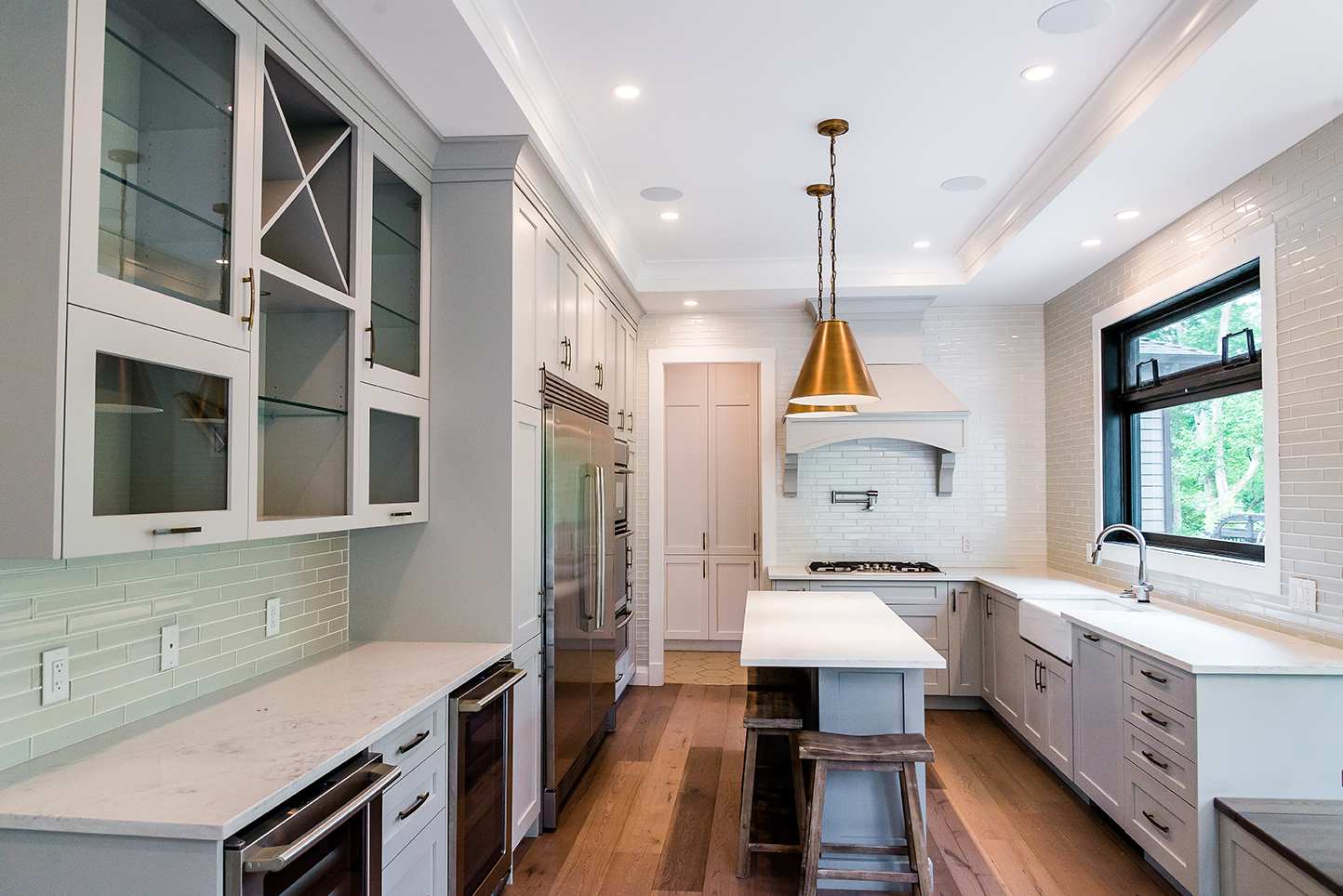 The architectural pendant lights illuminating the kitchen island are one of our favorite features, along with the custom milled hood fan and subtly feminine shimmering pearl backsplash tile.