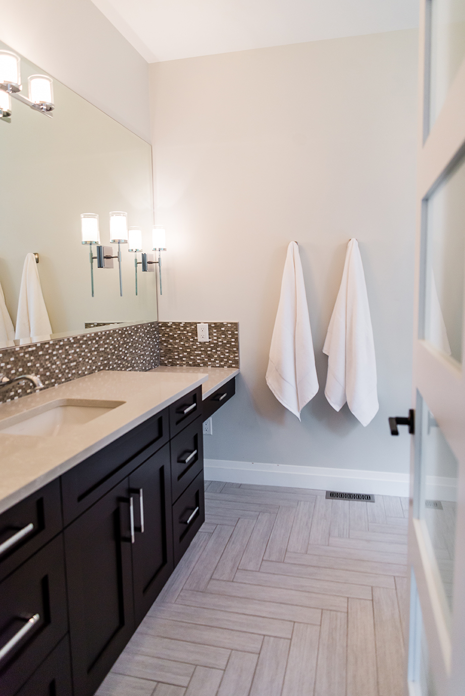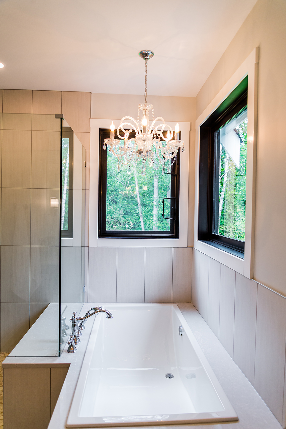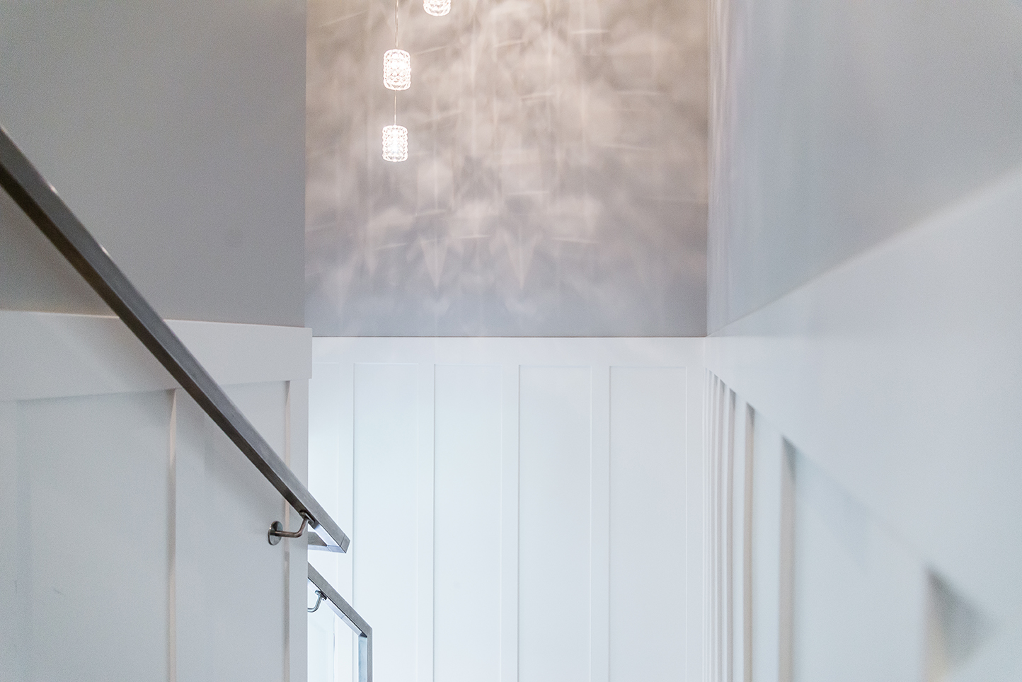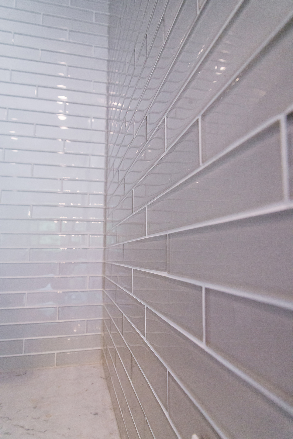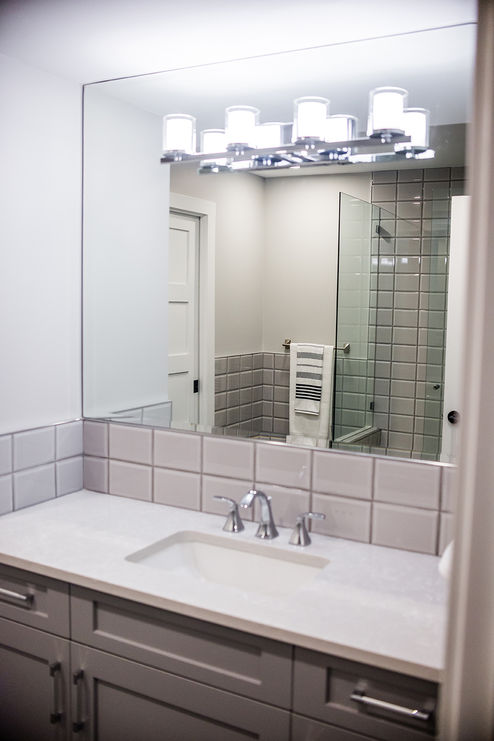 The architectural pendant lights illuminating the kitchen island are one of our favorite features, along with the custom milled hood fan and subtly feminine shimmering pearl backsplash tile.
