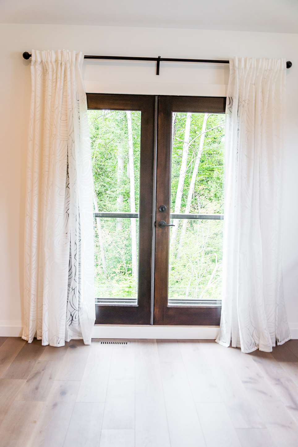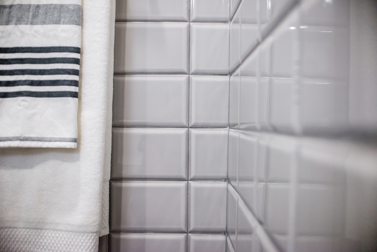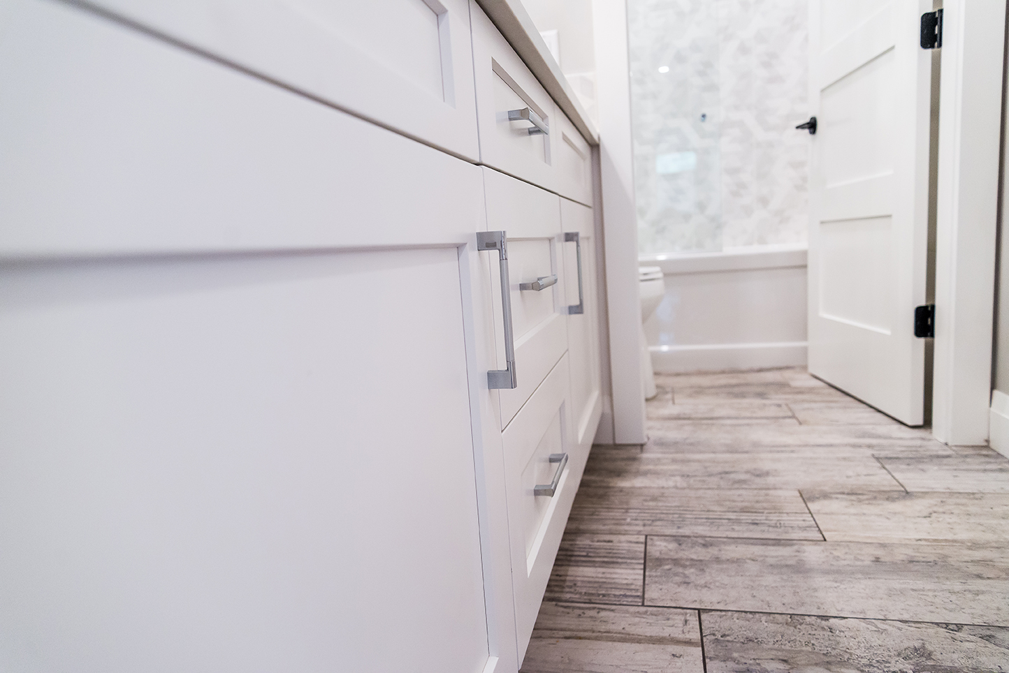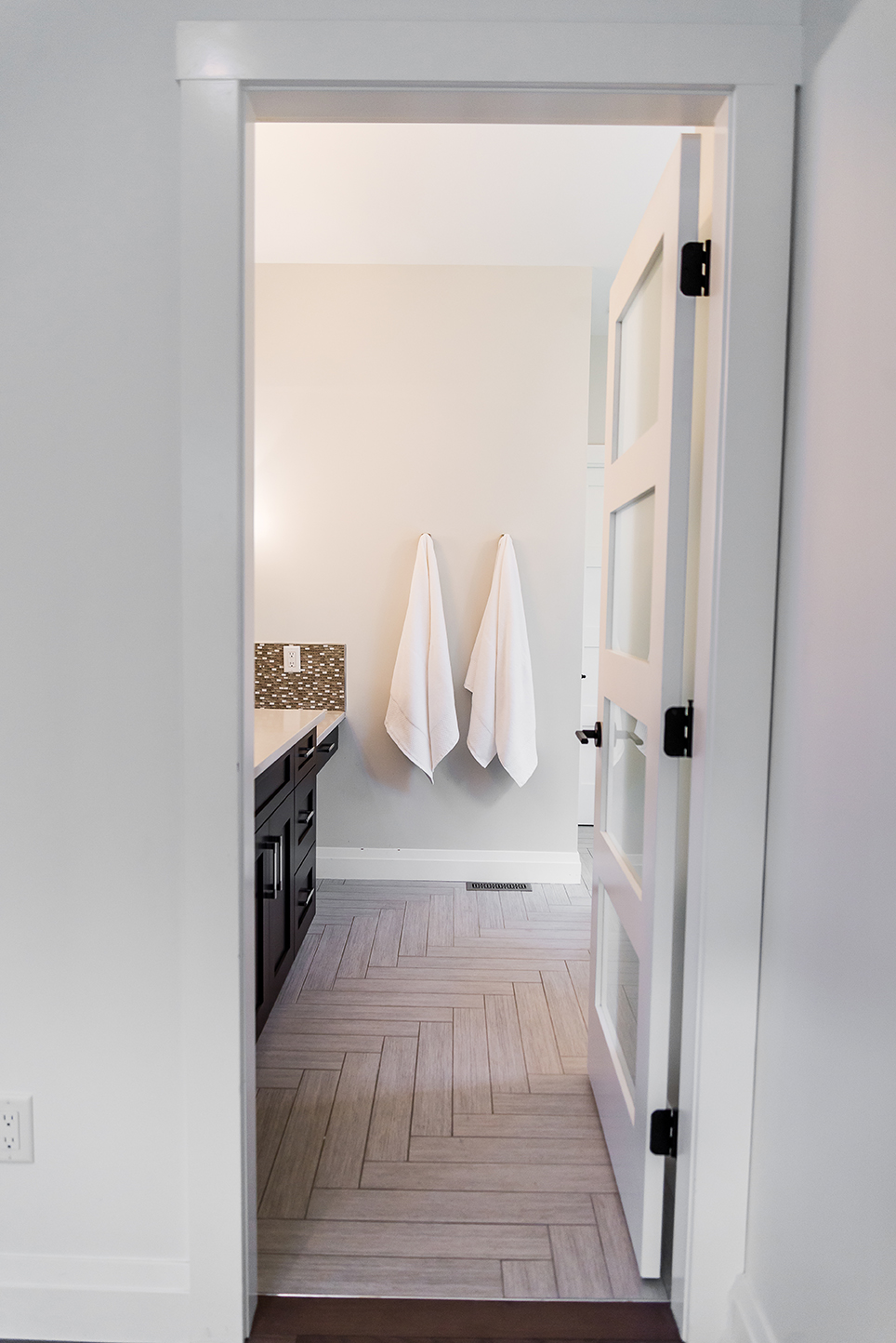 The architectural pendant lights illuminating the kitchen island are one of our favorite features, along with the custom milled hood fan and subtly feminine shimmering pearl backsplash tile.