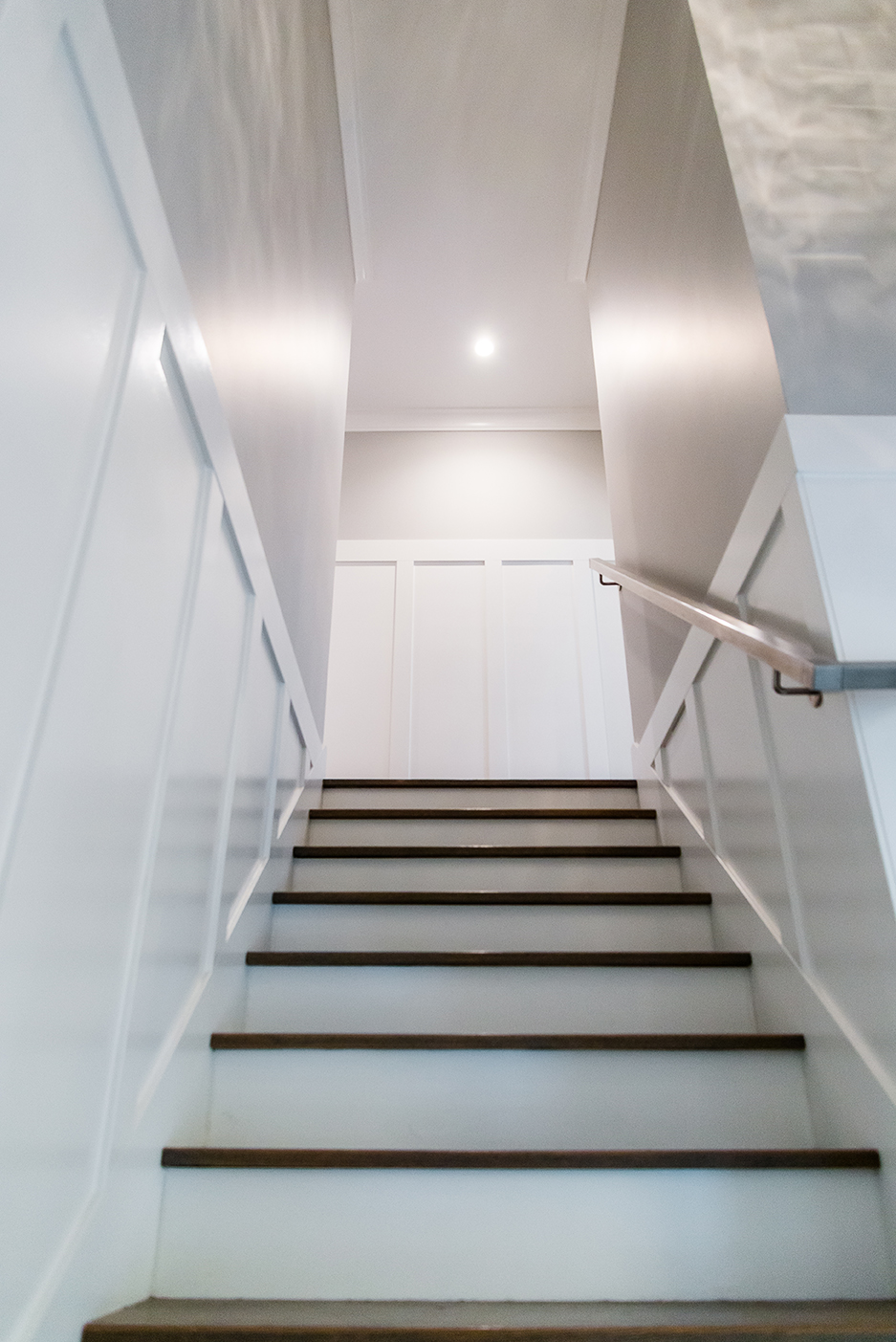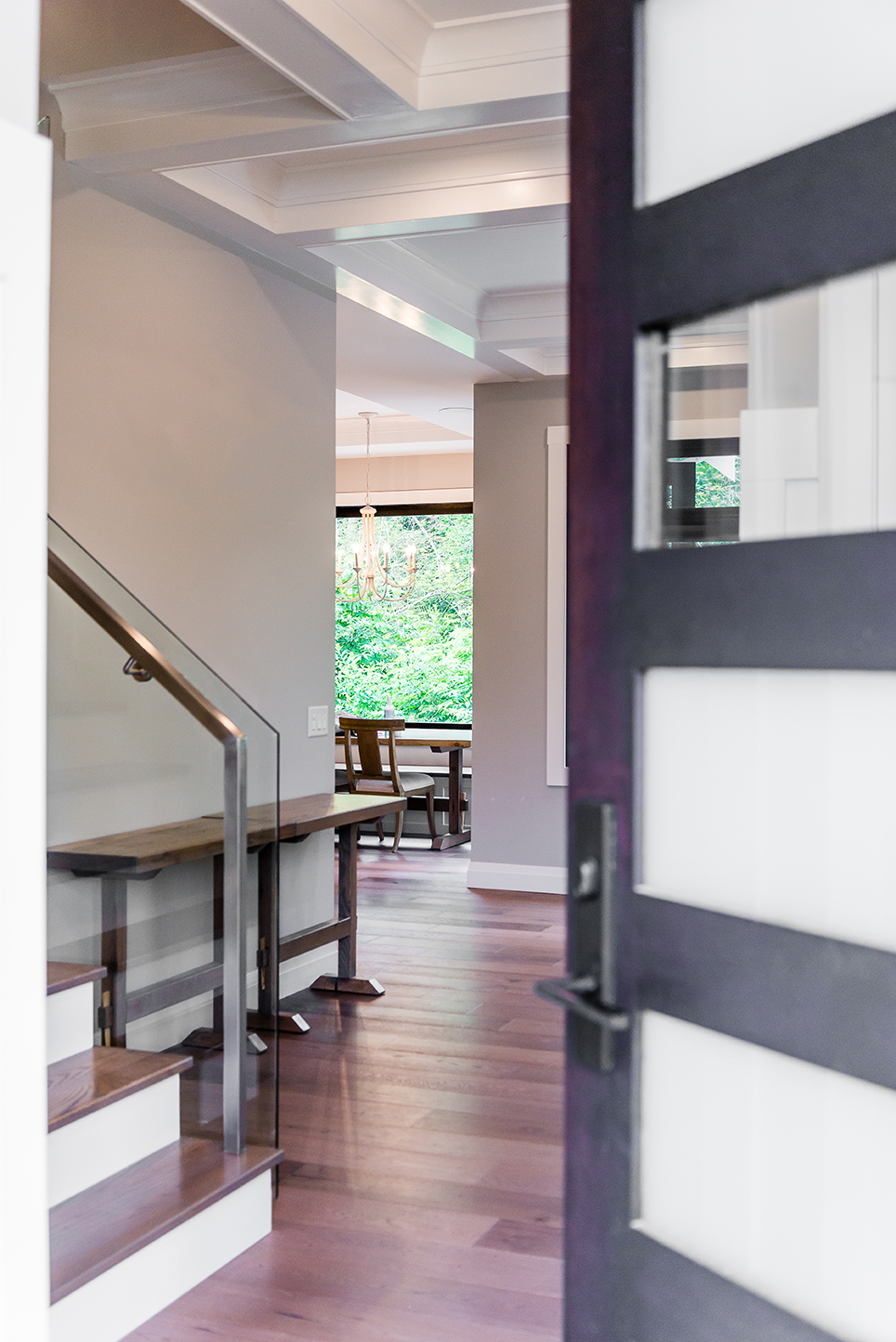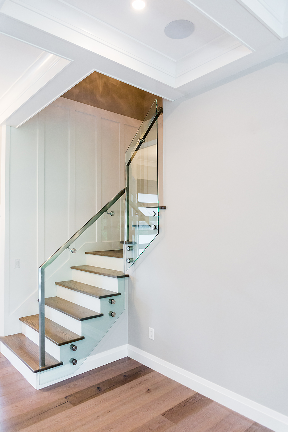 We can’t forget to mention the striking architectural stairs featured in this open-plan space. Visible upon entry, the clean lines, glass and chrome hardware are a true modern statement. No detail was missed while building this 5 bedroom, 3.5 bath luxury home.