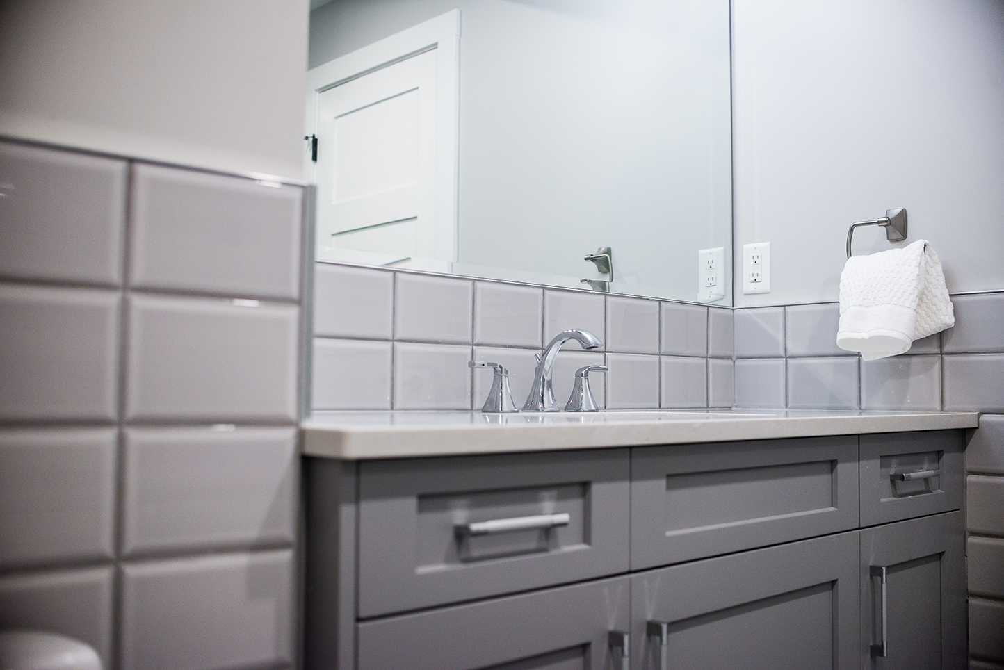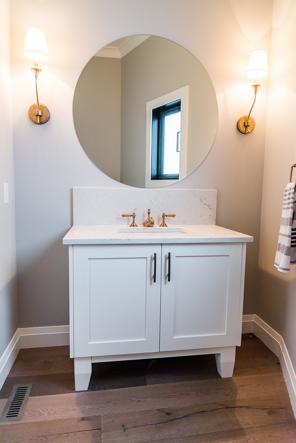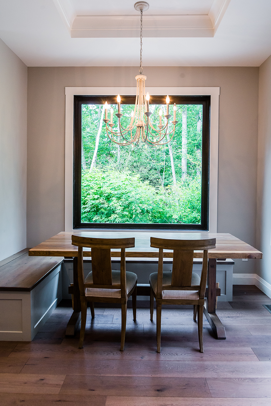 Airy, spacious and versatile, the open-concept living space was the perfect design choice for this modern day busy family of seven. The finishing was kept light and neutral by choosing shades of white and gray for the walls and cabinets. Elements of gold were introduced in hardware and lighting to add a warm and welcoming feel the whole family could love.